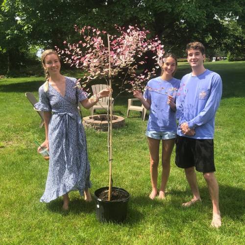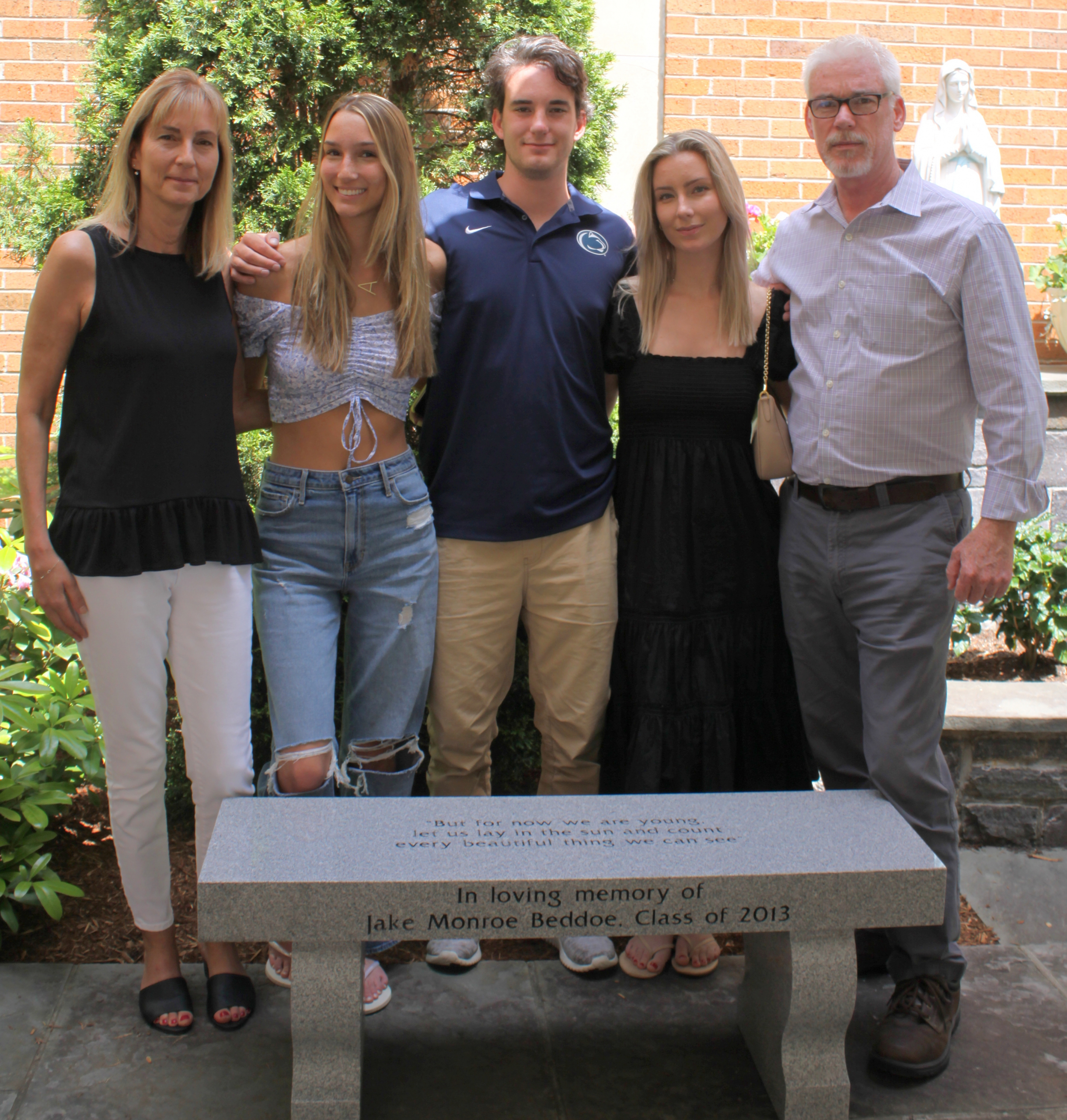 Bench dedication at St. Joseph High School. The memorial bench was a gift from Harvest Partners (Carly's employer)